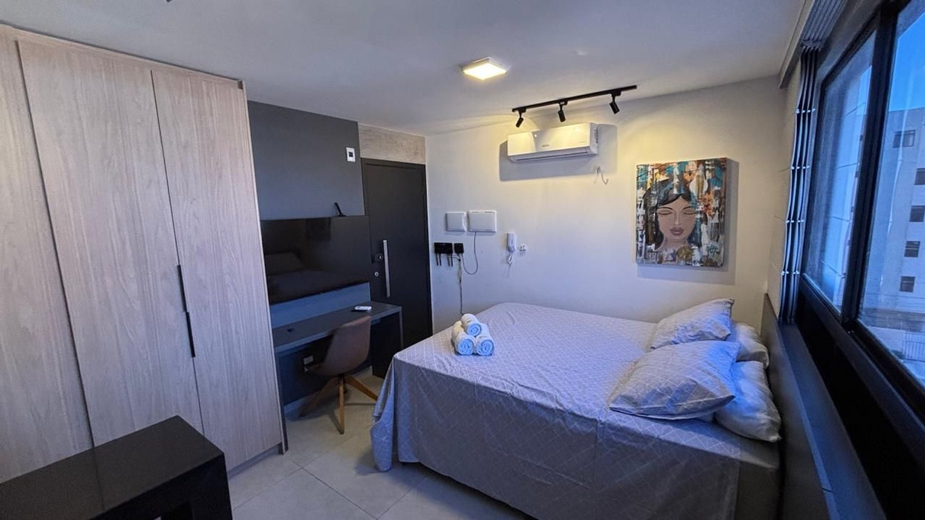Tudo bem arrumado e higienizado para receber você . O quarto espaçoso com Ar condicionado.
