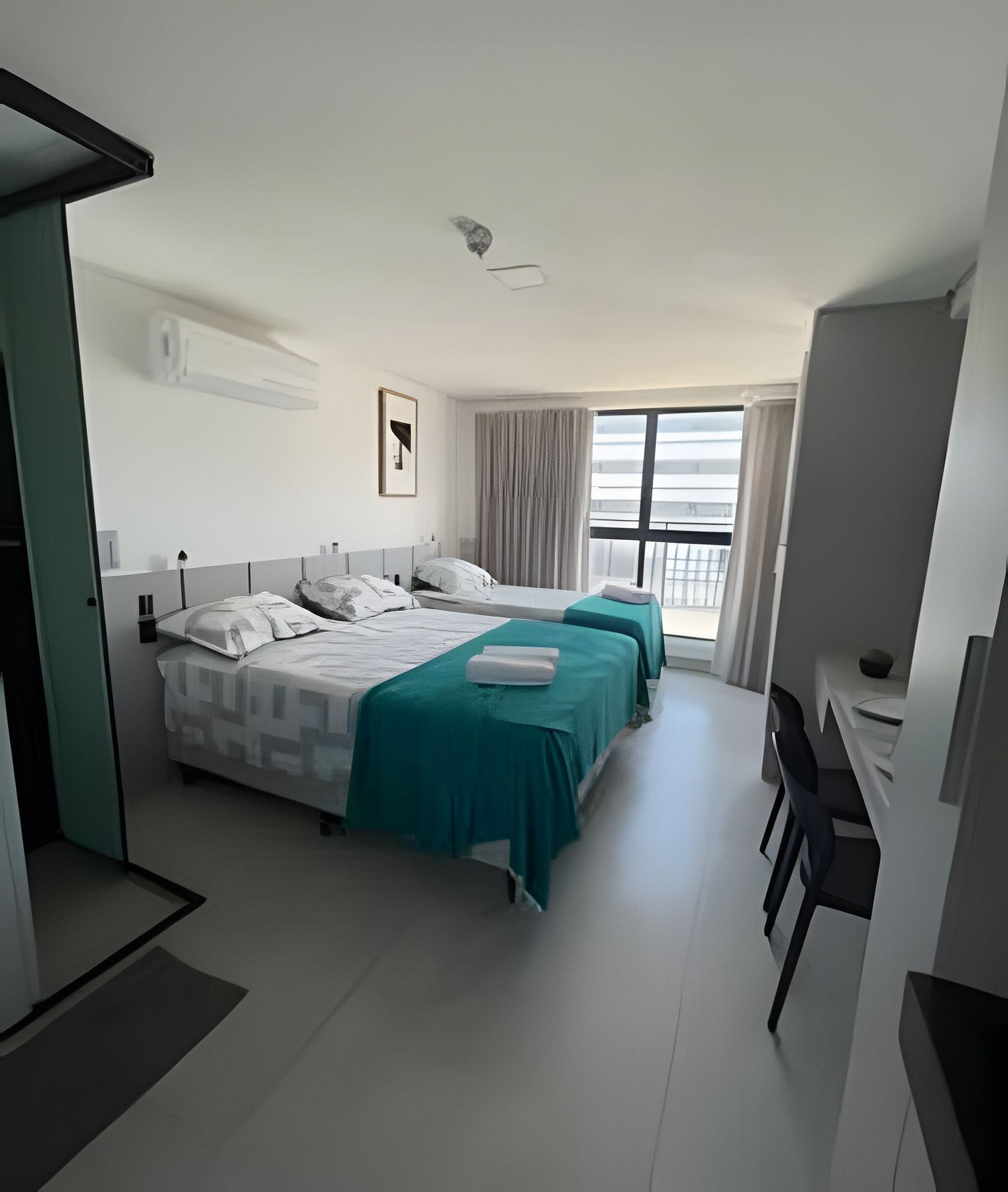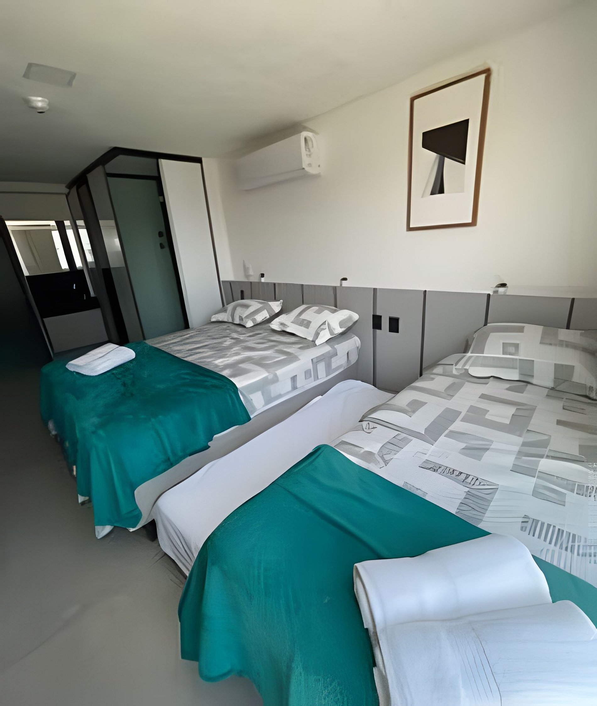 - Quarto com 1 cama tamanho Queen e 1 cama de solteiro com cama auxiliar, Guarda-roupa, SmartTV e Ar condicionado;